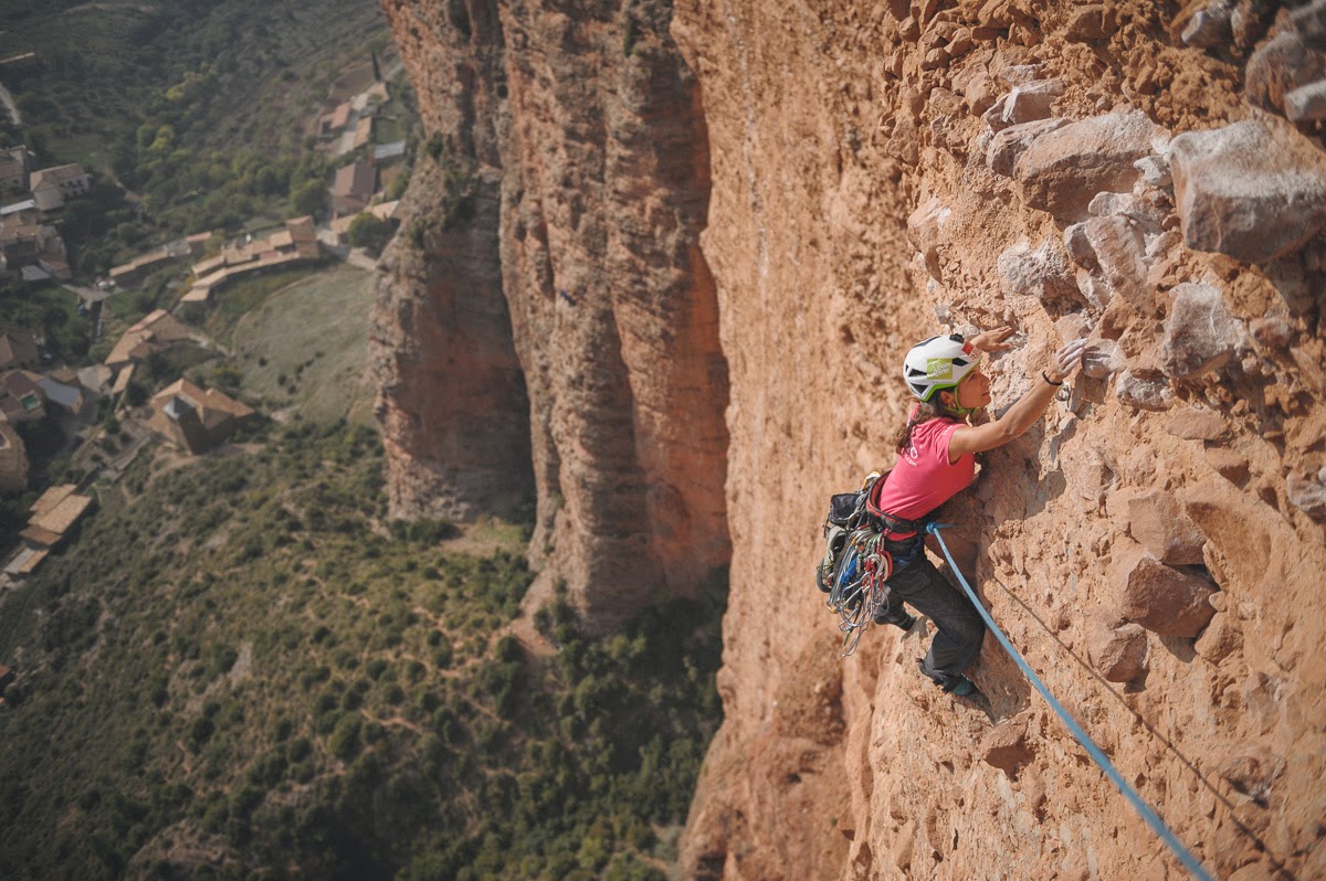 Ante mi desconcierto, los recuerdos de mi amiga Cris estallando su cabeza contra el muro de Montserrat al perderse por la vía Easy Rider volvieron, pero esta vez... para joder. Después de muchos años sin escalar, decidí ganar al miedo y hacerme fuerte. Pensaba que estaba todo más que superado, que el recuerdo me daba poder, valor para hacer las cosas bien, para ser consciente, para dominarme (esa cabeza....). Su error fue mi martirio durante un tiempo pero después lo entendí como mi enseñanza.. me hizo capaz, otra vez, valiente.. y así concebía ese sentimiento (en positivo) hasta que me vi colgada de nuevo en Riglos... joder Cris... Una vez pies en la tierra, centré la cabeza y analizé cada milésima de situación: palabras de Nano, Pedro, visuales a la pared, buenas conversaciones entre chicas a pie de vía (gracias!), la sonrisa de Cris y mi interior que no quería dejar de luchar, eh Bi, no te vayas a rendir ahora, acaba con esto, hazte mejor, hazte capaz!.. no em siguis dèbil ara, ho estaves fent molt bé, joder.... Así que ayudada por un muy buen refuerzo emocional, el Animal, costó un cigarrito del menda (no mío, odio ese pasatiempo adictivo) para atarme (nos) otra vez y subir la Mosquitos.